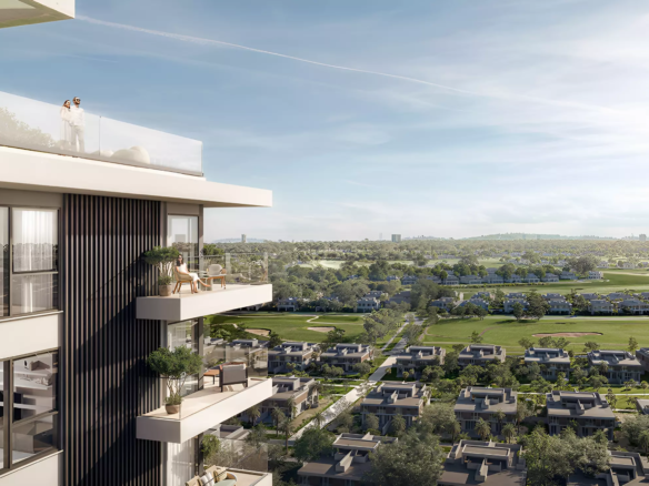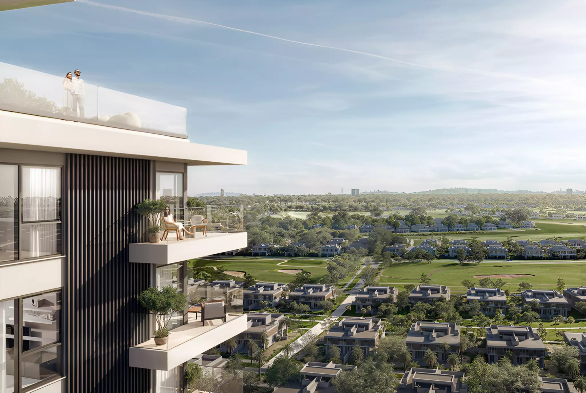 • Located in Dubai Hills Estate with views of greenery, golf course, and the city skyline